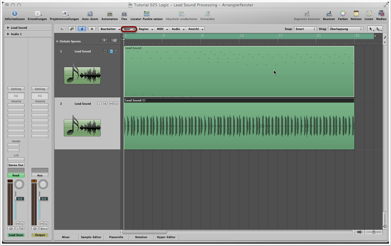 2) Wir bouncen zunächst eine Performance als Audiofile, legen diese in einer neuen Audiospur in Logic an und fügen die Effekte als Audio-Inserts hinzu. Dies spart Rechenleistung und wir können uns ausschließlich auf das Processing konzentrieren. Zudem ist es in der Regel angenehmer, schneller und einfacher mit Audio zu arbeiten, als mit MIDI-Daten. Wir entscheiden uns für diese Methode und erzeugen über “Spur” -> “Neu” eine neue Audiospur, in die wir unseren gebouncten Lead-Sound per Drag&Drop hineinziehen. Sofern wir unsere Performance noch als MIDI-Daten im gleichen Projekt haben, können wir diese auch unter “Region” -> “Regionen bouncen auf Festplatte” direkt bouncen. Eine neue Audiospur wird anschließend automatisch erzeugt.