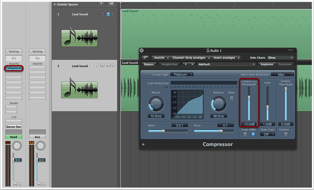 Vereinfacht gesagt verringert ein Audio-Kompressor den Unterschied zwischen den leisesten und den lautesten Signalanteilen, wodurch unser Lead-Sound etwas kompakter wirkt. Da der Kompressor jedoch nur die deutlich lautesten Signalanteile vom Pegel her reduzieren soll, sollte der Threshold nicht zu tief gewählt werden. Für unser Klangbeispiel hat sich ein Wert von -15dB als passend erwiesen (2).