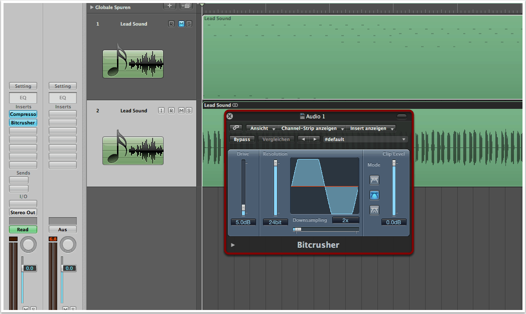 Als zweites Audio-Insert wählen wir mit dem Bitcrusher einen Distortion-Effekt aus und übernehmen die Einstellungen aus der Abbildung. Unser Lead-Sound wird dadurch etwas rauer und aggressiver.