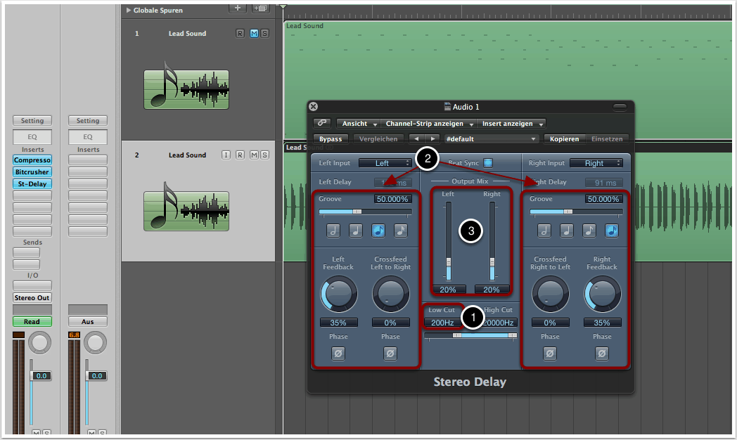 Mit den Werten in der rechten bzw. linken Hälfte der St-Delay-Oberfläche kann herumexperimentiert werden – je nach Setting verändert sich das Pattern und ein anderer Rhythmus entsteht. Mit den Werten “Feedback” und “Crossfeed” sollte man jedoch vorsichtig umgehen, da sich das Delay ansonsten unendlich in die Länge ziehen kann (2).