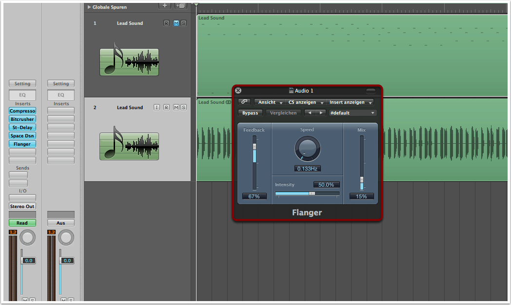 Ein Flanger ist, genau wie ein Phaser oder Ensemble-Effekt, ein Modulationseffekt, der ein Signal mit der Zeit verformt. Unser Lead-Sound wirkt dadurch ein wenig breiter und lebendiger.