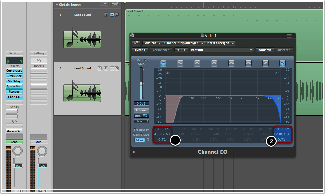 Wir rufen einen Channel EQ auf und binden zunächst einen Low-Cut ein, um alle störenden Frequenzen unter 50Hz zu filtern (1).