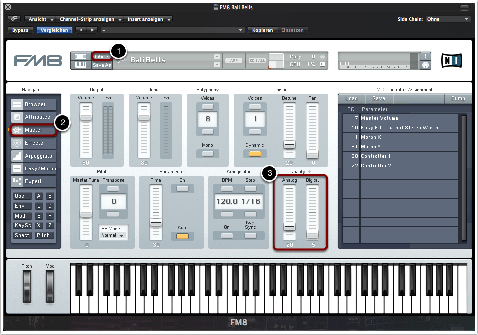 Im Untermenü “Quality” bringen wir den Analog-Regler auf den Wert 20 und den Digital-Regler auf den Wert 5 (3). Dies erzeugt minimale Distortion-Artefakte, die unseren Sound etwas weniger steril wirken lassen.