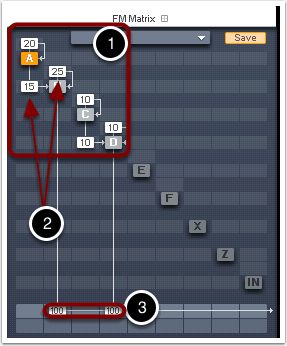 Die zwei Werte 100 am unteren Ende der FM-Matrix bewirken, dass lediglich die Oszillatoren B und D zum Output gesendet und wiedergegeben werden (3). 100 bedeutet dabei einen Volume-Anteil von 100%. Die Oszillatoren A und C hingegen werden nicht direkt wiedergegeben, sondern fungieren lediglich als Frequenzmodulatoren.