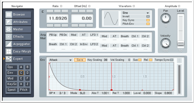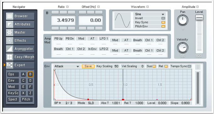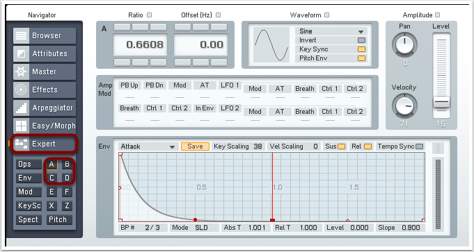Über die Buchstaben auf der linken Seite können wir im Expert-Menü die Hüllkurve, die Wellenform und weitere Eigenschaften der Oszillatoren und des Filters bestimmen. Wir klicken auf das Feld A und stellen die Parameter entsprechend der Abbildung ein. Analog verfahren wir auch mit den Oszillatoren B, C und D. Nach dem Justieren der Oszillatoren müssen wir möglicherweise die Master-Volume (im Master-Menü) reduzieren, um Übersteuerungen zu vermeiden.