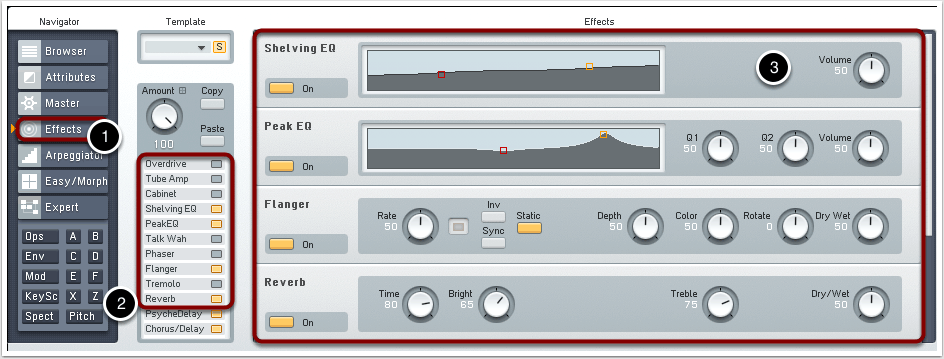 4.1 Effekte: Shelving EQ, Peak EQ, Flanger und Reverb