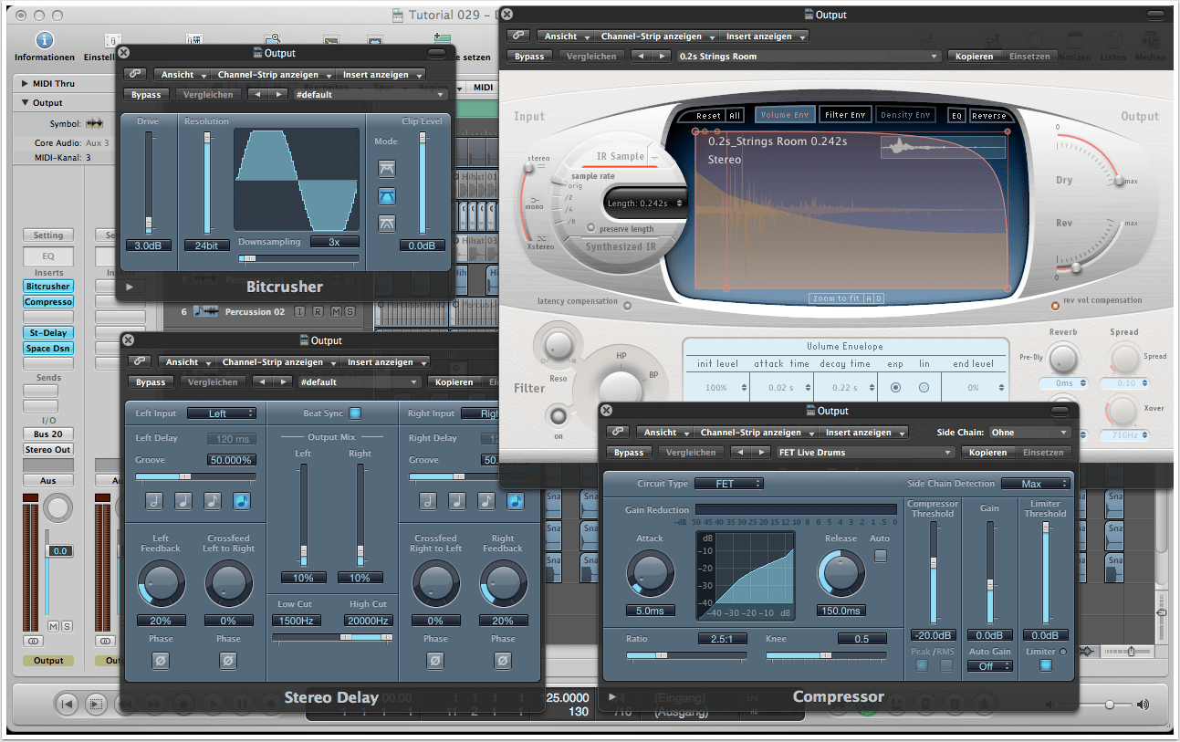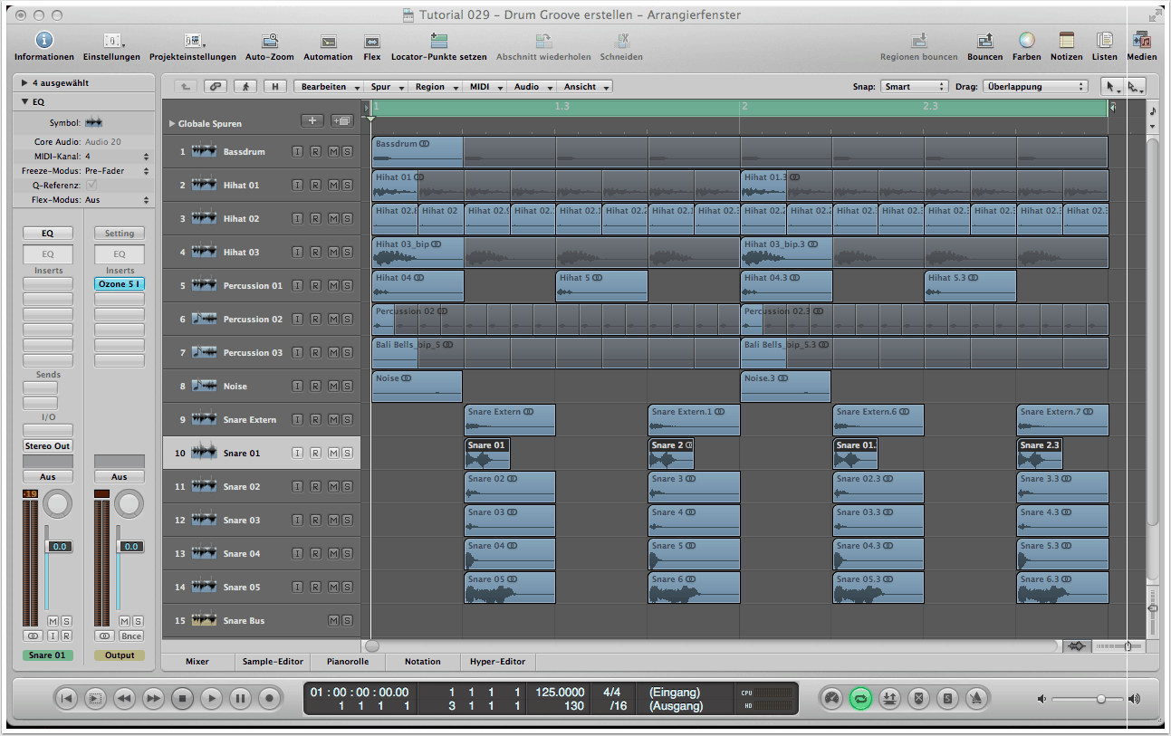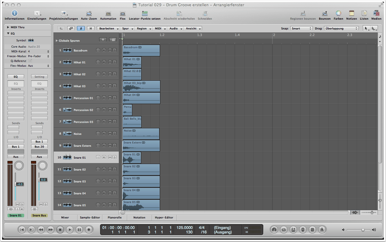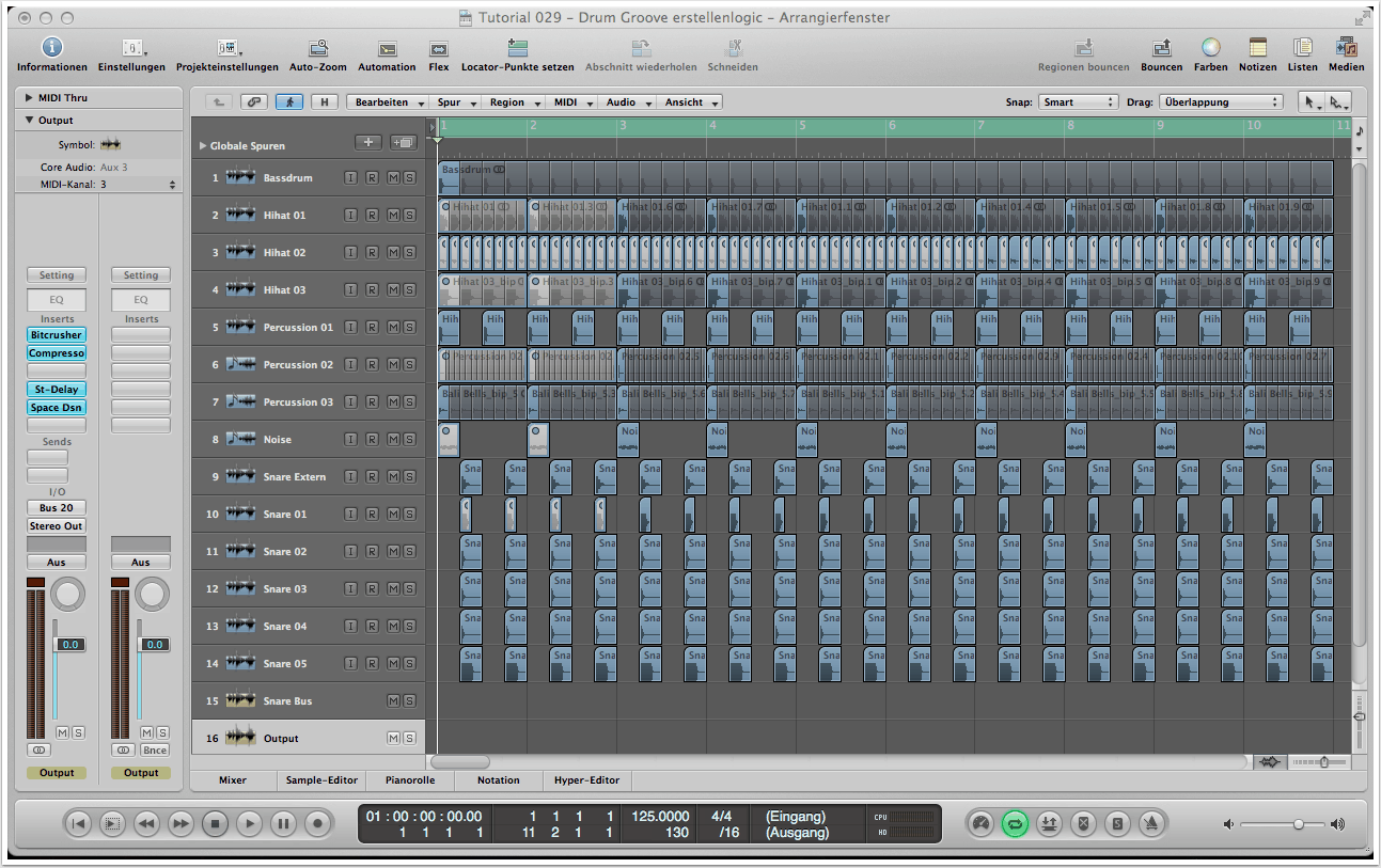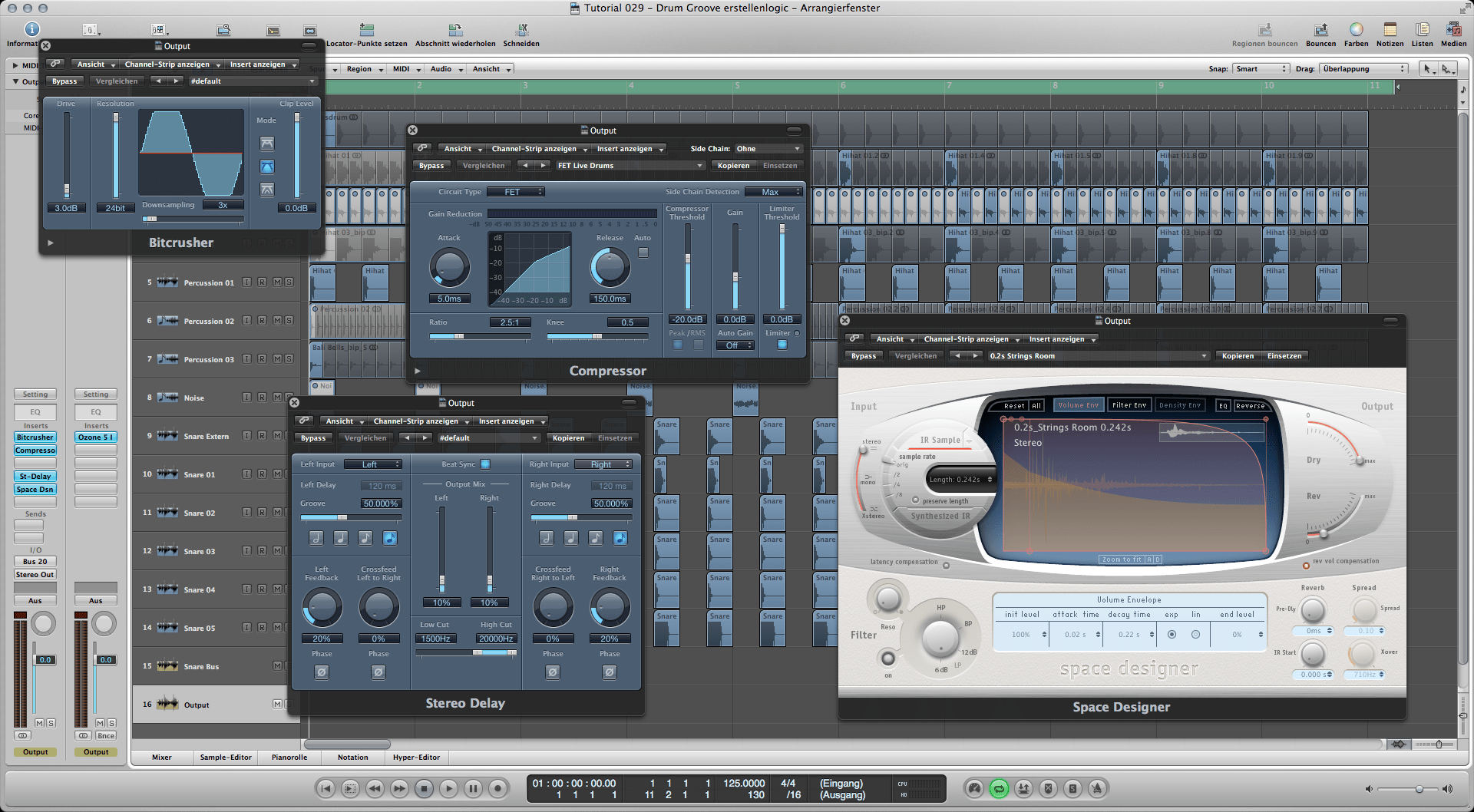 In Tutorial 028 haben wir aus unterschiedlichen Audio-Aufnahmen (Klangbeispiel 01) eine Reihe von Drum und Percussion Samples erstellt (Klangbeispiel 02). In diesem Tutorial wollen wir diese Samples als Grundlage für einen Drum Beat verwenden (Klangbeispiel 03). Wir verwenden dazu Logic Pro als DAW und benutzen ausschließlich integrierte Plug-ins. Natürlich kann aber auch eine andere DAW – z.B. Ableton Live oder Cubase – verwendet werden.
