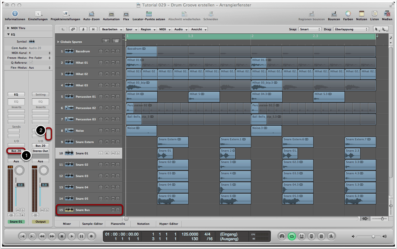 Bei Bedarf können wir über einen Bus und einen Aux-Channel eine Subgruppe bilden. Dies macht insbesondere dann Sinn, wenn ein Element aus verschiedenen Layern besteht, wie in unserem Fall die Snaredrum. In Logic wählen wir dazu als Output einen beliebigen Bus aus (1). Ein Aux-Channel wird in der Folge automatisch erzeugt. Um diesen auch im Arrangierfenster anzeigen zu lassen, wählen wir mit einem Rechtsklick auf den Bus “Arrangierspur erzeugen/auswählen” aus (2). Bewegen wir nun den Fader des Aux-Channels, wirkt sich dies auf alle sechs Snare-Layer gleichzeitig aus.