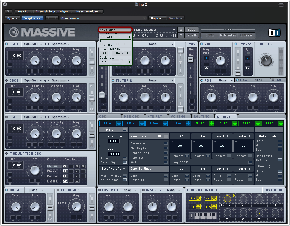 Wir öffnen Massive als Stand-Alone-Version oder als Plug-in einer beliebigen DAW. Über “File” -> “New Sound” laden wir einen neuen Patch.