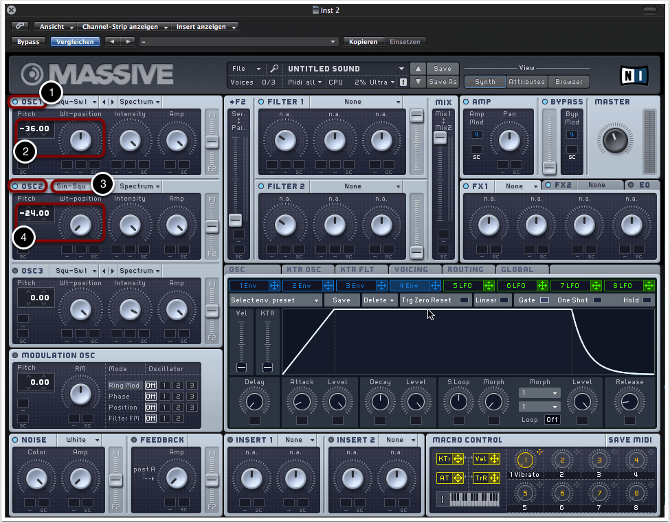 Den ersten Oszillator transponieren wir um 36 Halbtöne bzw. drei Oktaven nach unten. Den Wavetable-Positionsregler stellen wir auf etwa 12Uhr (2).