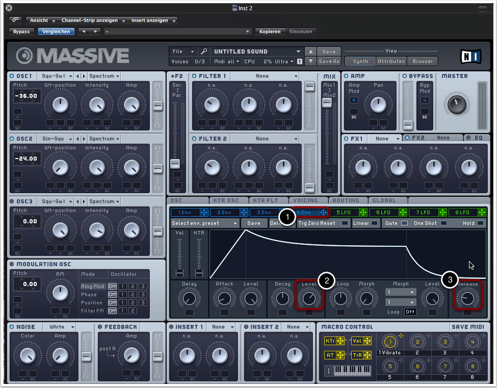 Den Level-Regler neben der Decay ziehen wir ein wenig herunter, um die Attack der Bassline mehr zu betonen und ihr mehr Punch zu verleihen (2).