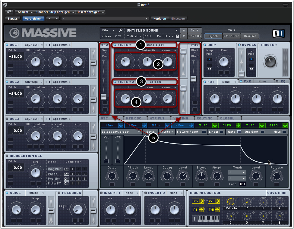 In der Filter-Sektion aktivieren wir Filter 1 und wählen “Bandreject” als Filtertyp aus (1). Wir übernehmen die Werte für Cutoff, Bandwidth und Resonance aus der Abbildung (2).