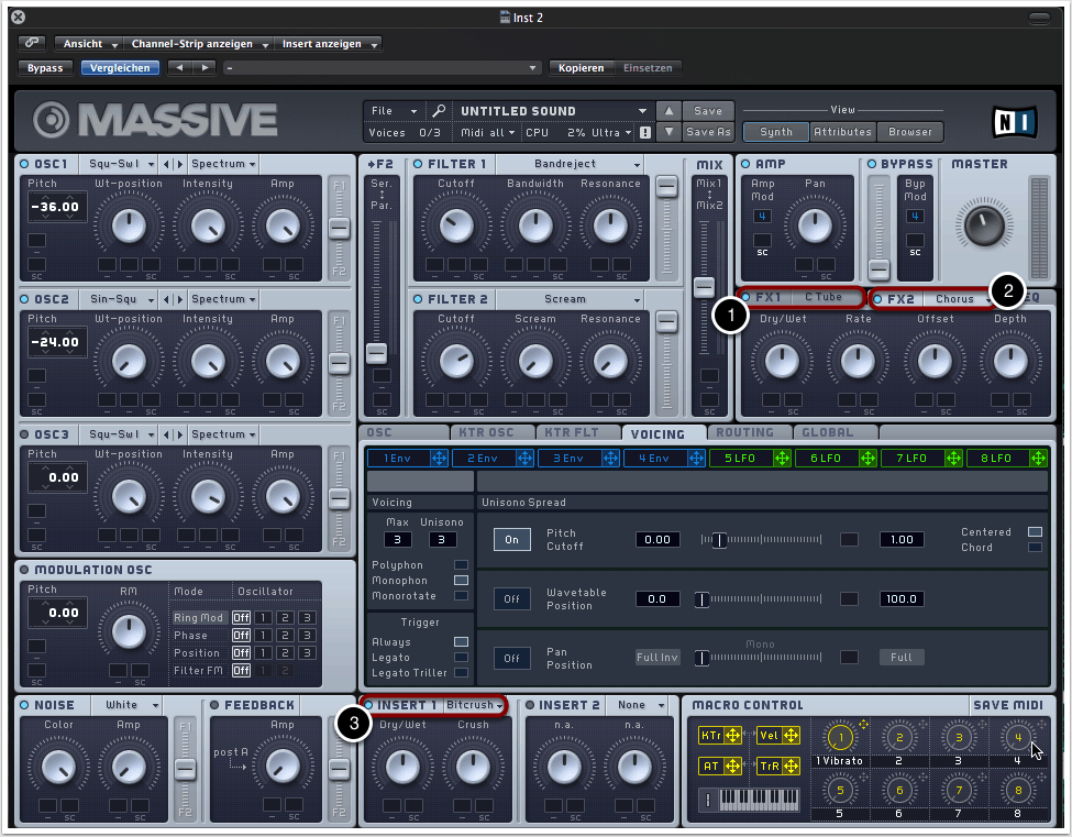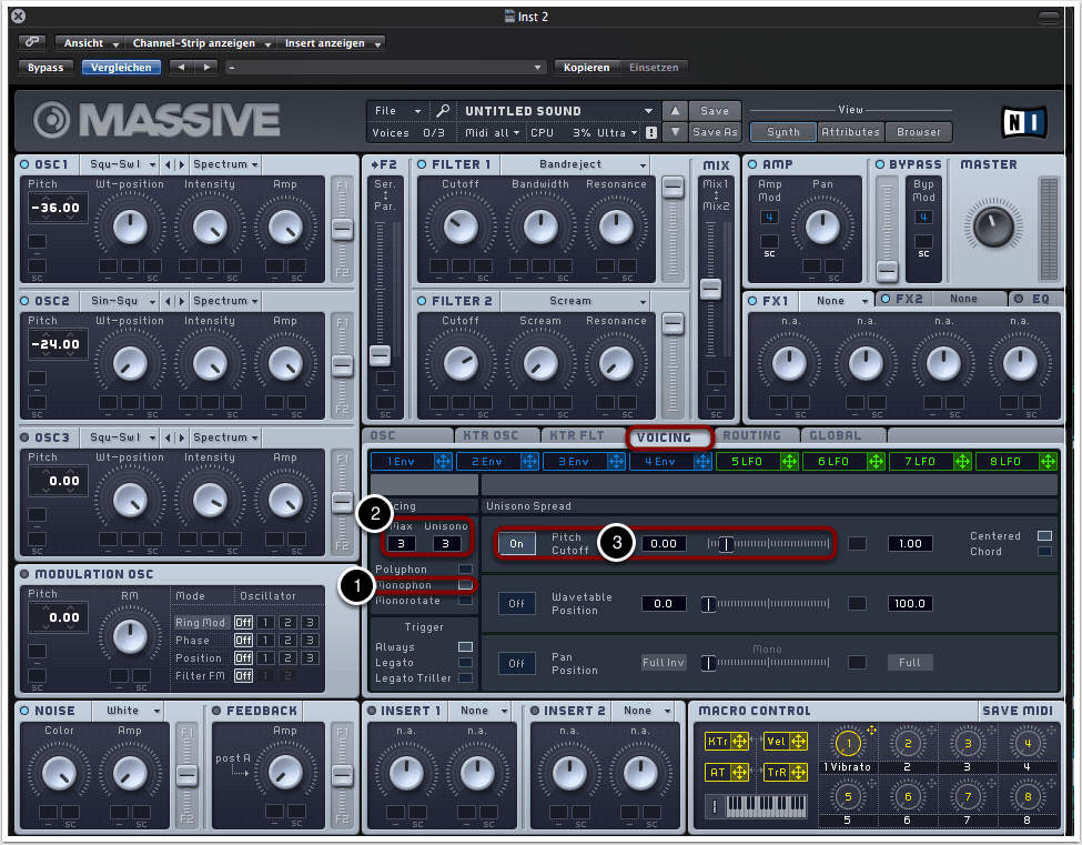 Im Bereich “Voicing” stellen wir unseren Oszillator zunächst auf “monophon” (1).