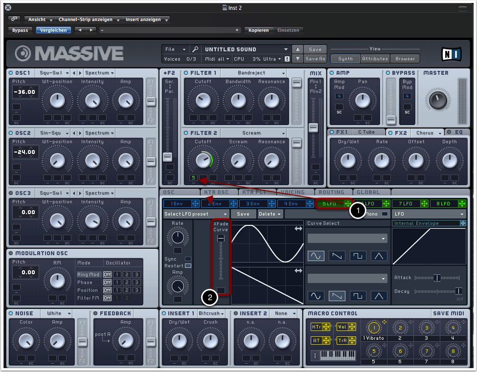 Den Fade-Curve-Regler in der LFO-Sektion ziehen wir ganz nach oben, so dass die Cutoff-Frequenz nur durch die obere Sinuskurve gesteuert wird (2).