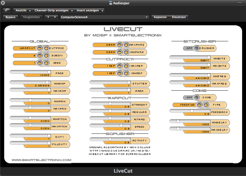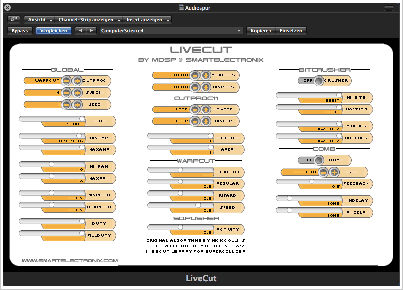 Da das Programm mit Zufallsalgorithmen arbeitet, entsteht bei jedem Playback ein neues Slice-Pattern. Es ist daher sinnvoll, gleich mehrere Versionen von jedem Setting zu bouncen und anschließend die beste Version rauszusuchen. Auch mehrere Instanzen von Livecut in der gleichen Spur können zu noch abgedrehteren und interessanteren Ergebnissen führen.
