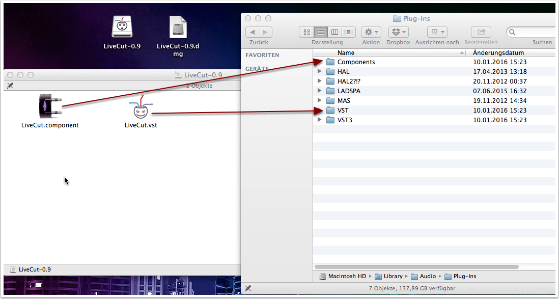Wir öffnen die .dmg- bzw. .zip-File. Die Installation erfolgt nicht automatisch, d.h. wir müssen die enthaltenen Dateien “LiveCut.com…ponent” und “LiveCut.vst” manuell in die richtigen Ordner verschieben. Mac-User folgen dabei diesem Pfad: Macintosh HD -> Library -> Audio -> Plug-Ins. Die .component-File muss nun in den Ordner “Components” bewegt werden und die .vst-File in den Ordner “VST”.
