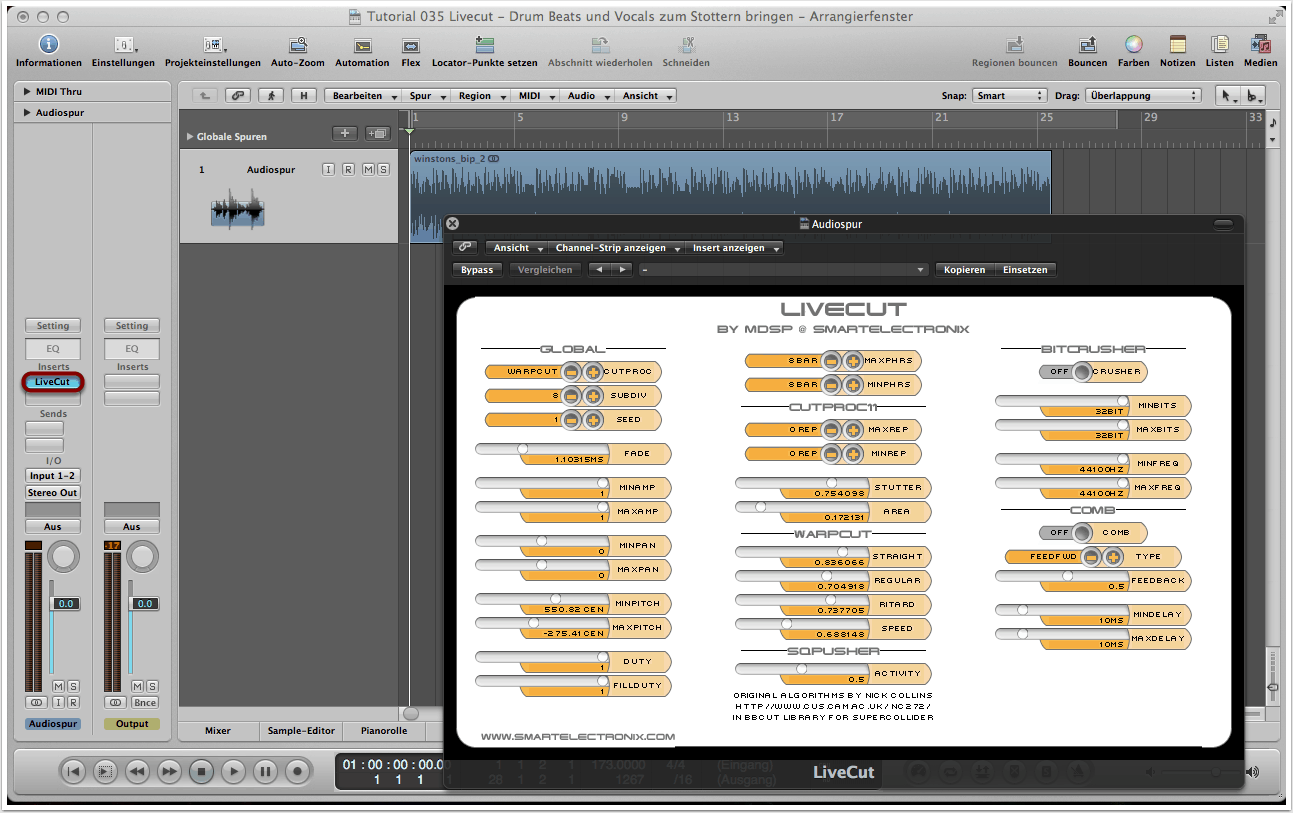 Wir wählen Livecut als Plug-in aus. In Logic wählen wir dazu im Inserts-Menü auf der linken Seite “Audio Units” -> “Mdsp @ Smartelectronix” -> “Livecut” aus.
