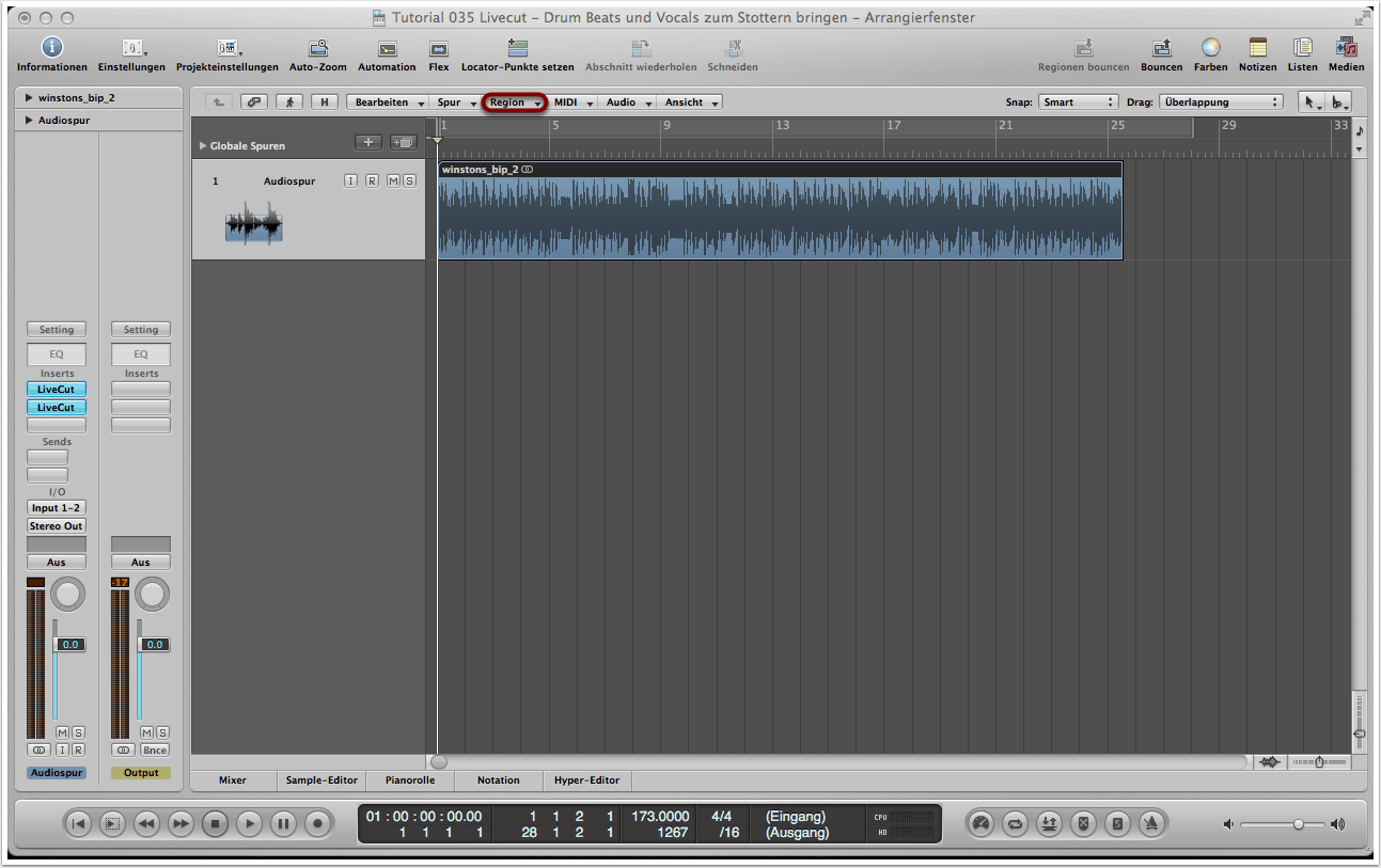 Wichtig: Livecut funktioniert nur während des Playbacks, d.h. die Audiodatei muss – am besten als Loop – kontinuierlich abgespielt werden.