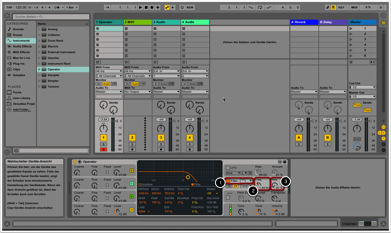 Indem wir den Cutoff-Frequenz-Regler nach links bewegen, können wir das Signal filtern. Je weiter nach links wir den Regler ziehen, desto stärker wirkt die Filterung und desto dumpfer wird unser Signal (2). Mit dem Regler daneben können wir die Resonanz des Filters bestimmen (3).