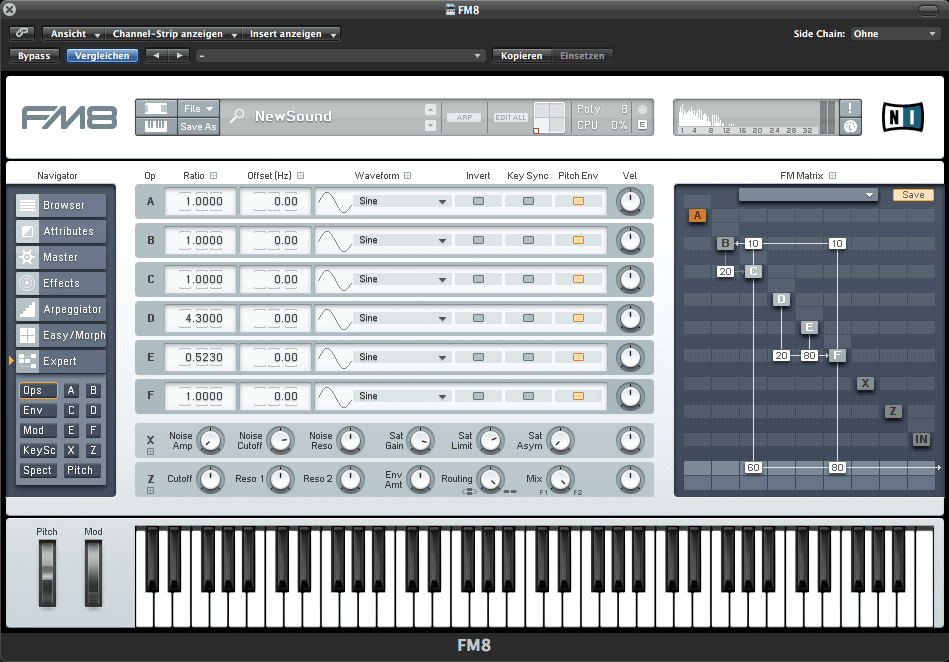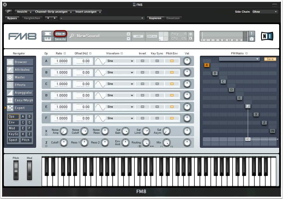 Wir öffnen eine Instanz von FM8 und erstellen unter “File” einen neuen Patch. Sofern unser MIDI-Keyboard korrekt angeschlossen und eingeschaltet ist, sollten wir bereits Klänge spielen können.