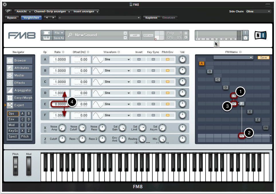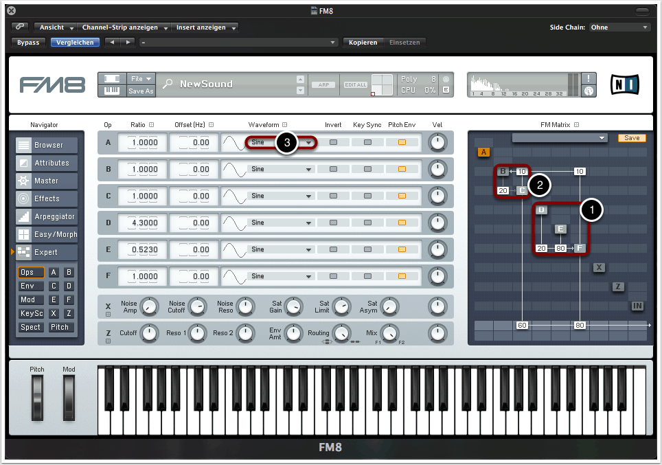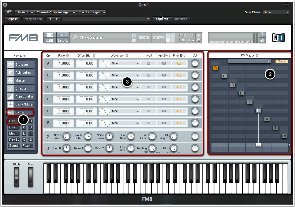Über das Fenster “Expert” und “Ops” auf der linken Seite (1) rufen wir die FM-Matrix (2) auf. Dies ist in gewisser Weise das Herzstück von FM8, da hier festgelegt wird, wie die einzelnen Oszillatoren sich gegenseitig beeinflussen.