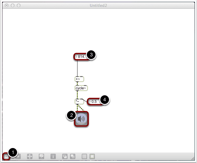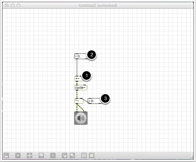 In die eine Box schreiben wir “cycle~” (1) und in die andere Box tragen wir “*~” (2) ein. Beim ersten Objekt handelt es sich um unseren Träger-Oszillator. Mit der Funktion darunter können wir das Output-Signal des Oszillators später um ein vielfaches verstärken oder abschwächen.