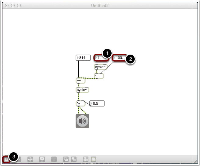 Bei den in Schritt 7 erstellten Objekten handelt es sich um den Modulator-Oszillator und um Regler, mit denen dessen Eigenschaften definiert werden können. Die mittlere Box repräsentiert die Modulationsfrequenz (1) und die rechte Box die Modulationstiefe (2).
