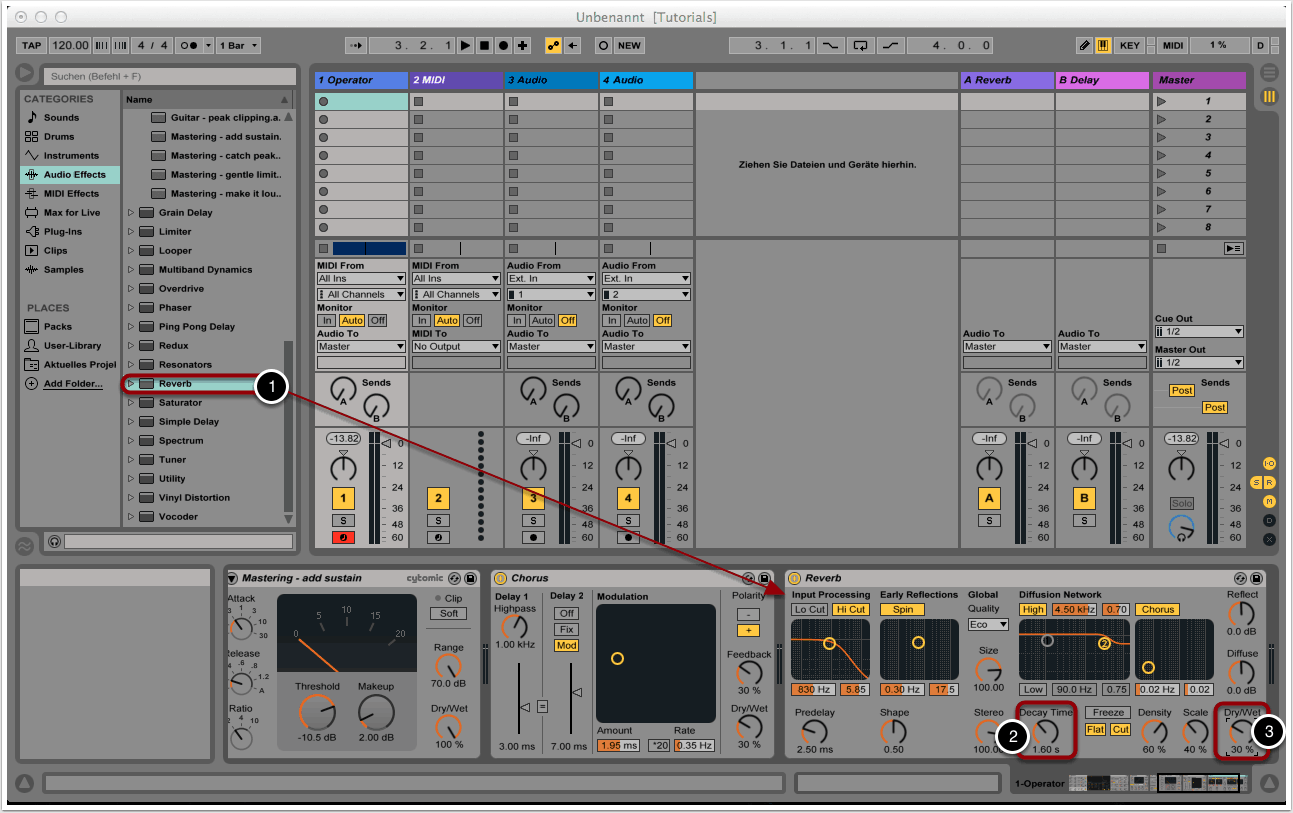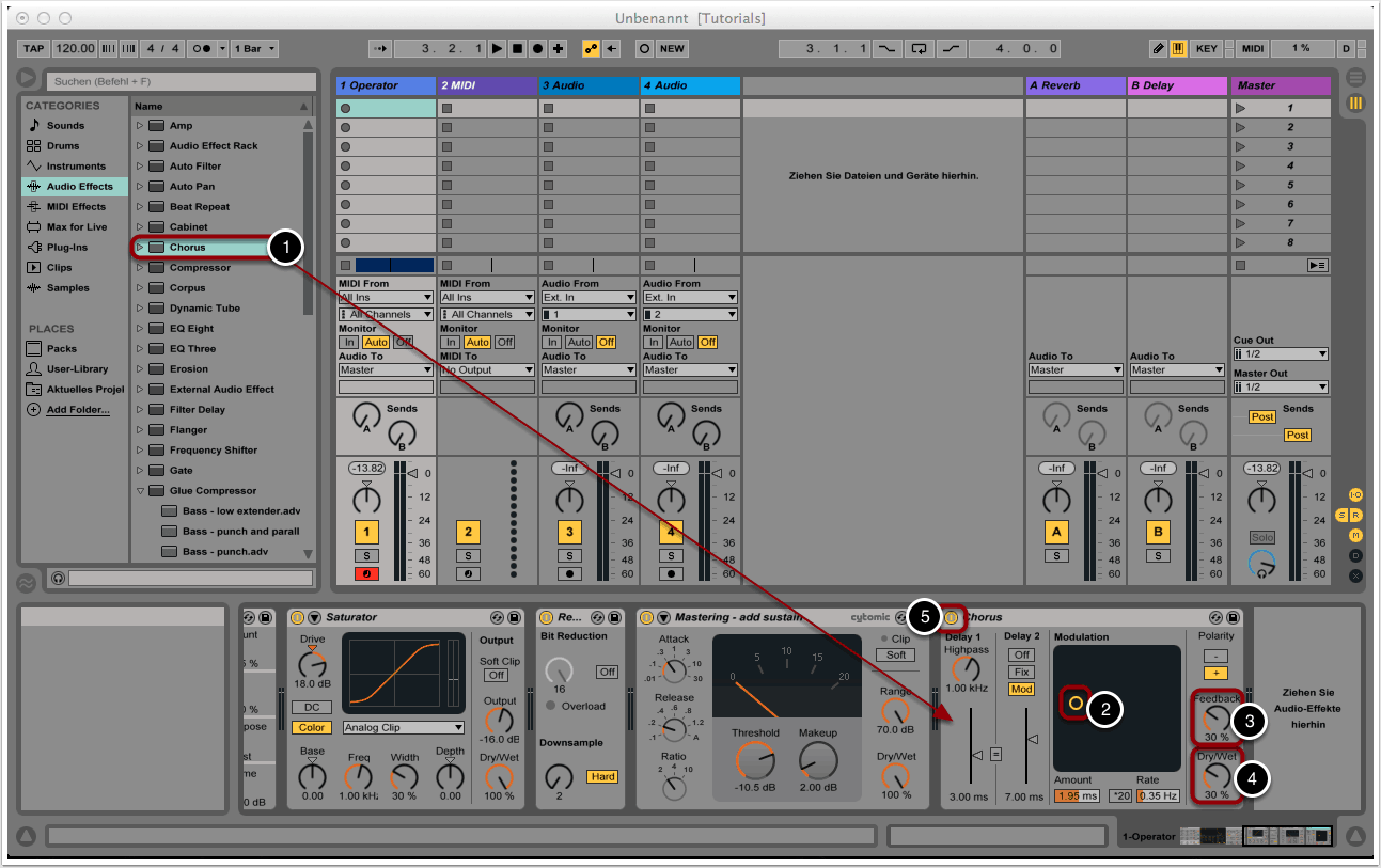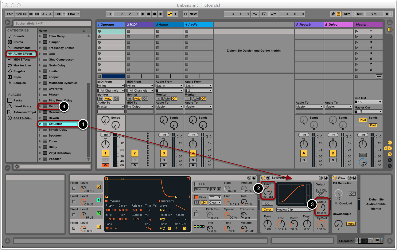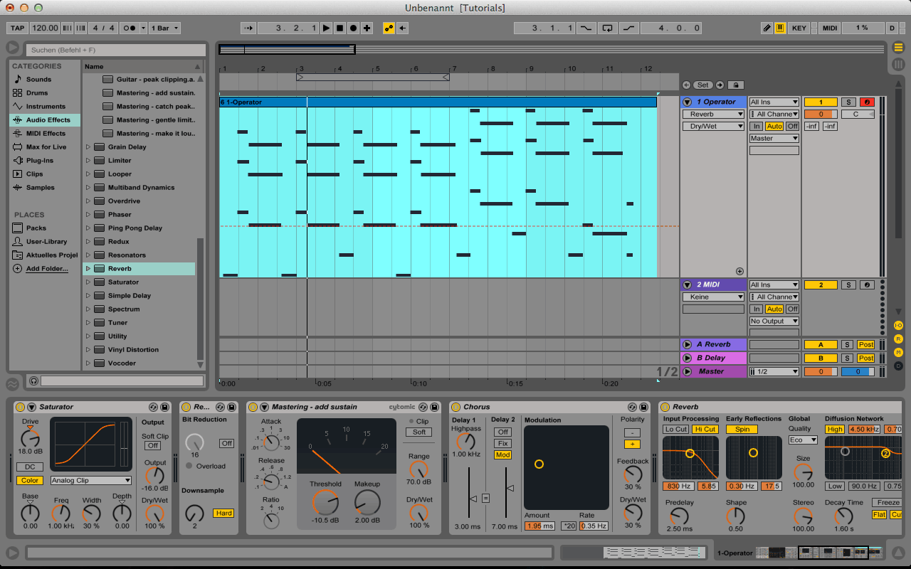 Nachdem wir in Tutorial 047 mit Ableton Lives Operator einen Lead Sound erzeugt haben, wollen in diesem Tutorial den Klang durch eine Reihe von Effekten weiter aufpeppen. Wir verwenden dafür ausschließlich integrierte Effekte von Ableton Live. Klangbeispiel 1 entspricht der rohen, unbearbeiteten Fassung und Klangbeispiel 2 der überarbeiteten, mit Effekten angereicherten Variante.