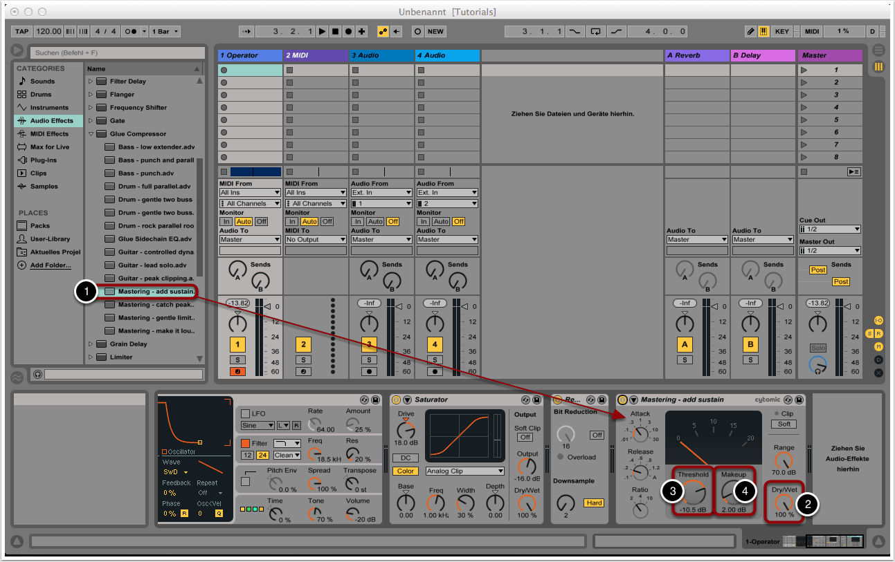Als nächsten Effekt wählen wir den Glue Compressor aus und das Preset “Add Sustain”. Wie der Name “Glue” andeutet, “kleben” dadurch die einzelnen Elemente des Lead Sounds besser zusammen und bilden eine klangliche Einheit (1).