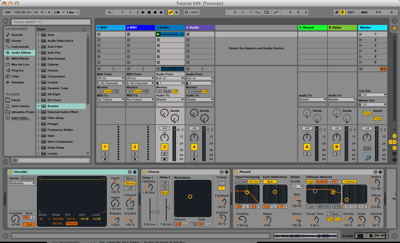 In diesem Tutorial wollen wir den integrierten Vocoder von Ableton Live benutzen, um atmosphärische Soundscapes und experimentelle Texturen zu gestalten. Als Ausgangsmaterial soll uns dazu ein simples Sprachsample (Klangbeispiel 01) dienen, welches wir durch den Vocoder und zusätzliche Audioeffekte klanglich verfremden (Klangbeispiel 02).
