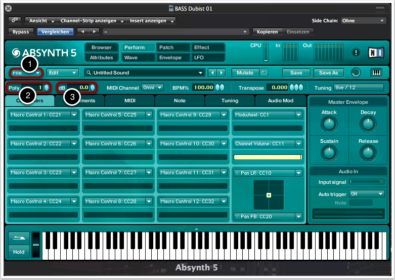Wir öffnen Absynth und laden unter “File” -> “New Sound” einen leeren Patch (1).