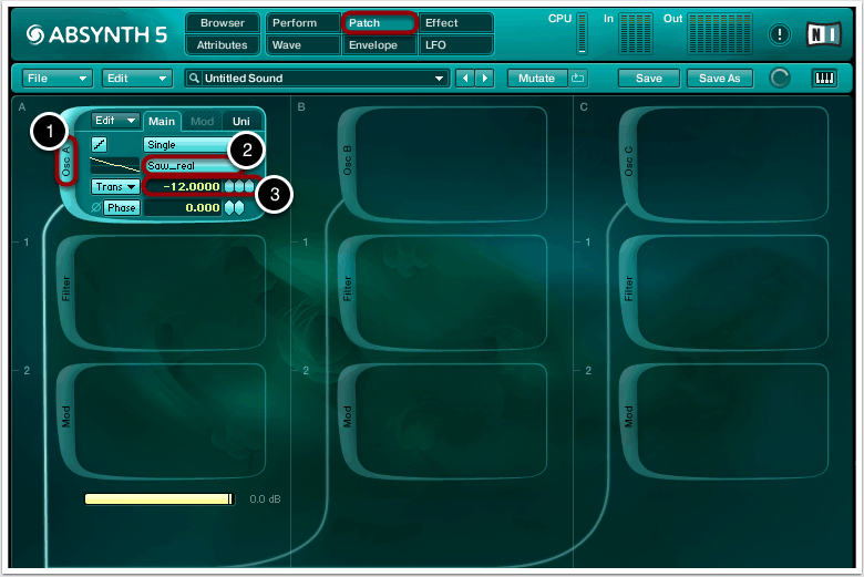 Im Patch-Menü aktivieren wir Oszillator A durch einen Mausklick in das zunächst noch leere Feld (1).