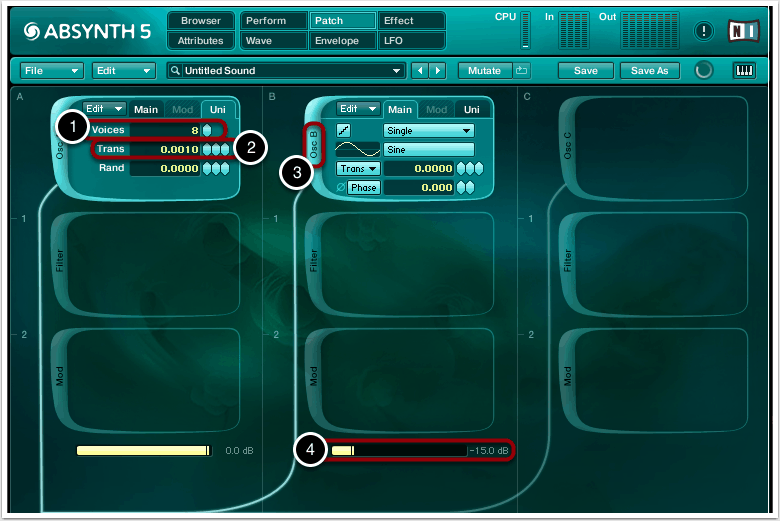 Außerdem aktivieren wir Oszillator B (3) und reduzieren die Output-Volume auf -15dB (4). Bei der Wellenform und den Unisono-Einstellungen von Oszillator B müssen wir nichts verändern.