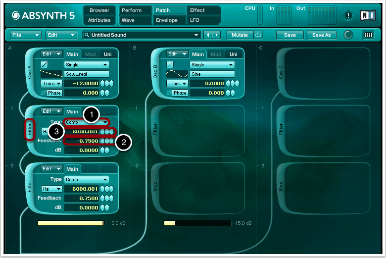 Wir aktivieren die beiden Filter von Oszillator A und wählen zweimal “Comb” als Filtertypen aus (1).