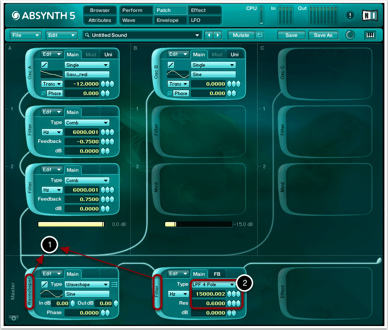 Bei den Werten des Waveshapers müssen wir nichts verändern. Die Grenzfrequenz des Lowpass-Filters legen wir auf 15000Hz fest und die Resonanz des Filters auf 0.6 (2).