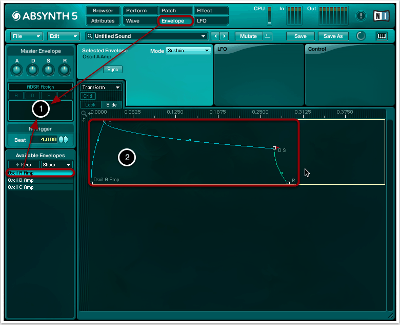 Im Envelope-Menü wählen wir Oszillator A an und übertragen in etwa die Hüllkurve aus der Abbildung (2).