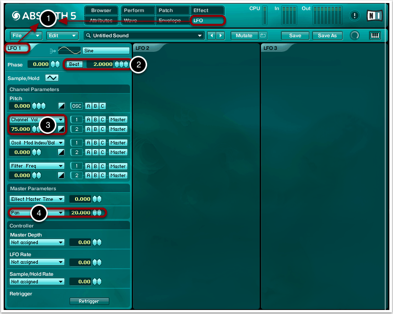Als Parameter, die von LFO 1 moduliert werden sollen, wählen wir “Channel Vol” (3) und “Pan” (4) aus und übernehmen die Werte aus der Abbildung. Je größer diese Werte sind, desto stärker ist die Modulation des jeweiligen Parameters.