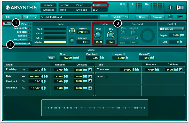 Wir entscheiden uns für den Effekt “Aetherizer” (2) und übertragen die Dry- und Wet-Werte aus der Abbildung (3). Die übrigen Parameter müssen wir nicht verändern.