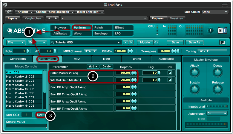 Über die Menüpunkte “Perform” -> “Assignments” können wir MIDI-Controller verschiedenen Parametern zuweisen (1).