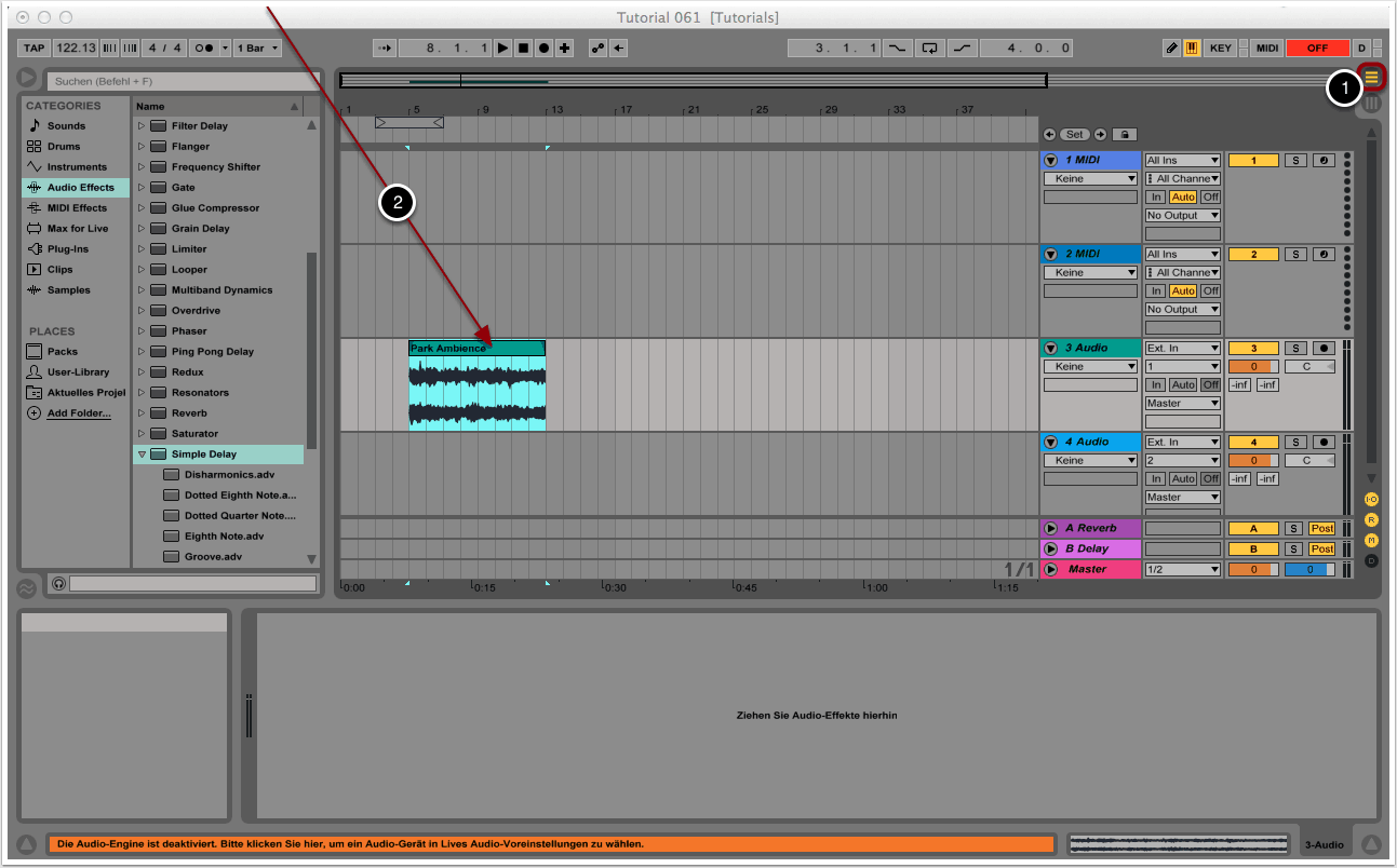 Wir erstellen in Ableton Live ein neues Projekt und wechseln zur Arrangement-Ansicht (1).