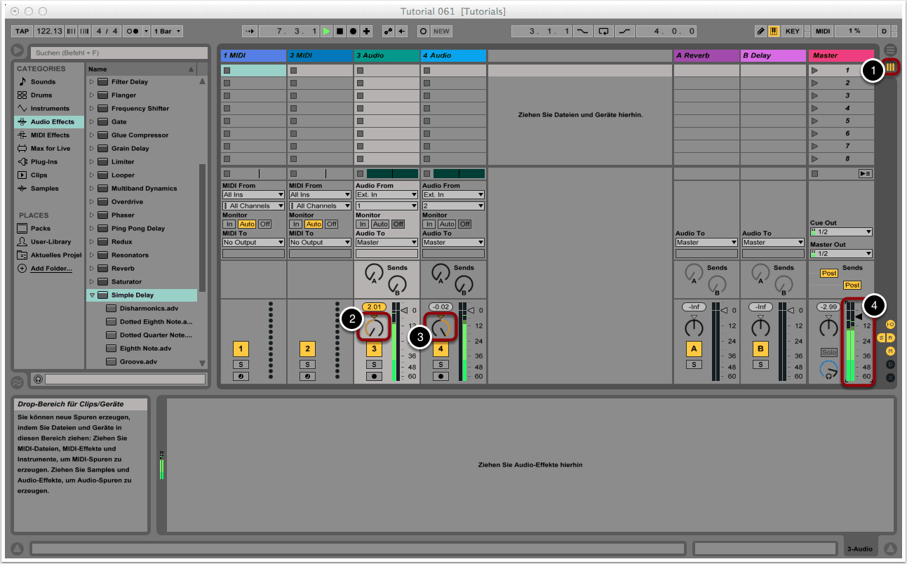 Möglicherweise müssen wir im Anschluss die Master-Volume reduzieren, um Übersteuerungen zu vermeiden (4).