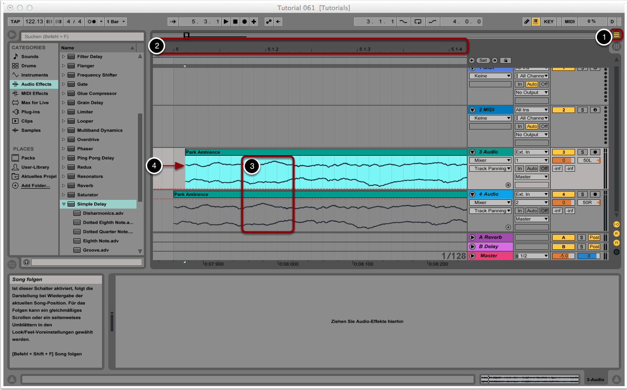 Wir erzeugen ein Sample Delay, indem wir eine der beiden Regionen minimal verschieben, so dass diese leicht versetzt abgespielt wird (4). Es ist wichtig darauf zu achten, dass dieser Versatz nicht zu groß gewählt wird, da die Wiederholung ansonsten als Echo wahrgenommen wird. Ein Versatz von nur wenigen Millisekunden (z.B. 2 oder 3) oder gar Samples – daher die Bezeichnung Sample Delay – sollte genügen. Es gilt: Je größer der Versatz, desto größer der Stereoeindruck.