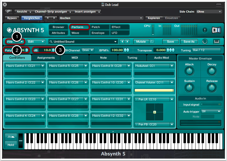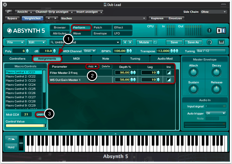 Über die Menüpunkte “Perform” -> “Assignments” können wir MIDI-Controller verschiedenen Parametern zuweisen (1).