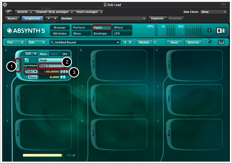 Im Patch-Menü aktivieren wir Oszillator A durch einen Mausklick in das zunächst noch leere Feld (1).