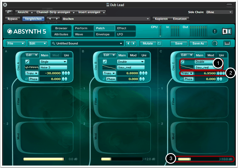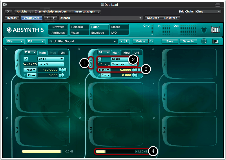 Wir wählen “Noise 3” als Wellenform aus (2) und transponieren den Oszillator um 30 Halbtöne nach unten (3).