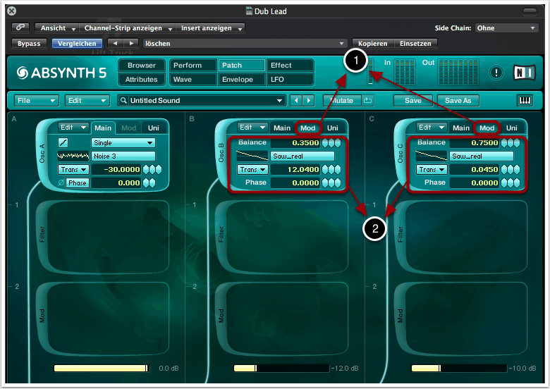 Wir rufen durch einen Mausklick das Mod-Menü von Oszillator B und C auf. Da wir “Double” als Syntheseform gewählt haben, können wir hier die Eigenschaften der beiden Nebenoszillatoren bestimmen (1).