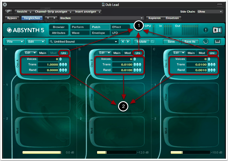 Wie im Schritt zuvor rufen durch einen Mausklick das Uni-Menü von Oszillator A, B und C auf. Hier können wir hier die Unisono-Eigenschaften, d.h. die Anzahl und das Verhalten von bis zu 8 simultanen Stimmen festlegen (1).
