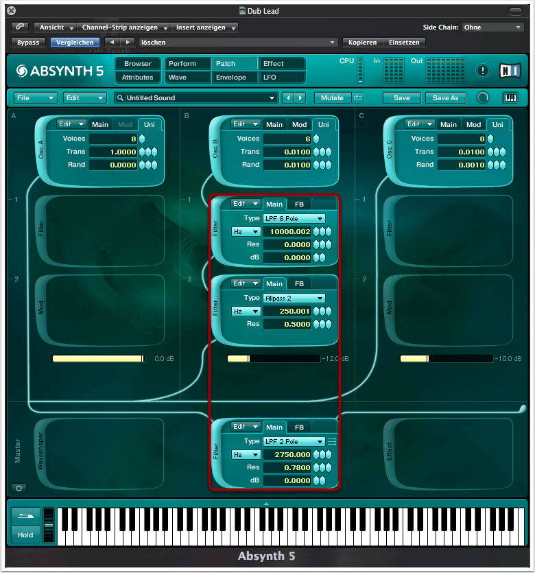 Wir aktivieren die beiden Filter von Oszillator B sowie den Master-Filter und übernehmen wie Werte für die Grenzfrequenzen und Resonanzen aus der Abbildung. Drei unterschiedliche Filtertypen kommen hier zum Einsatz: “LPF 8 Pole”, “Allpass 2” und “LPF 2 Pole”.