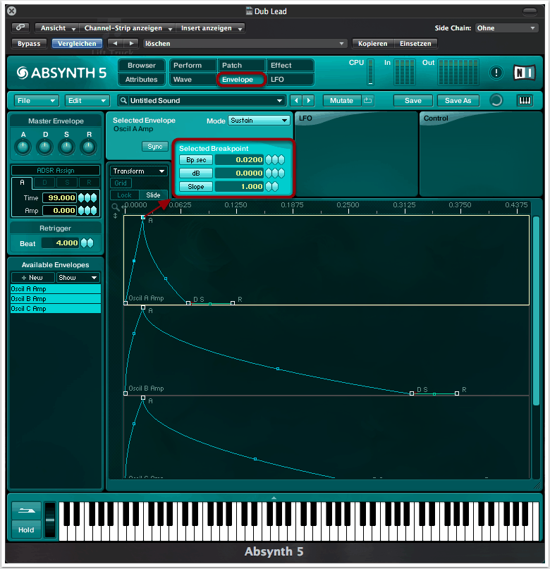 Um einen sehr kurzen, perkussiven Klang zu bekommen, ist es wichtig, die Volume-Hüllkurven anzupassen. Wir begeben uns hierzu ins Envelope-Menü und übertragen in etwa die Hüllkurvenverläufe aus der Abbildung. Diese müssen nicht zu 100% übereinstimmen, sollten aber dem ungefähren Verlauf aus der Abbildung entsprechen.
