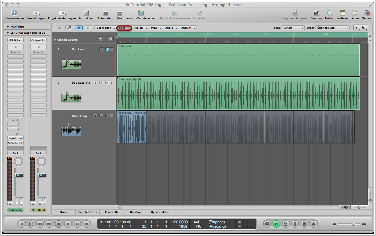 2) Wir bouncen zunächst eine Performance als Audiofile, legen diese in einer neuen Audiospur in Logic an und fügen die Effekte als Audio-Inserts hinzu. Dies spart Rechenleistung und wir können uns ausschließlich auf das Processing konzentrieren. Wir entscheiden uns für diese Methode und erzeugen über “Spur” -> “Neu” eine neue Audispur, in die wir unseren gebouncten Dub Lead per Drag&Drop hineinziehen. Sofern wir unsere Performance noch als MIDI-Daten im gleichen Projekt haben, können wir diese auch unter “Region” -> “Regionen bouncen auf Festplatte” direkt bouncen. Eine neue Audiospur wird anschließend automatisch erzeugt.